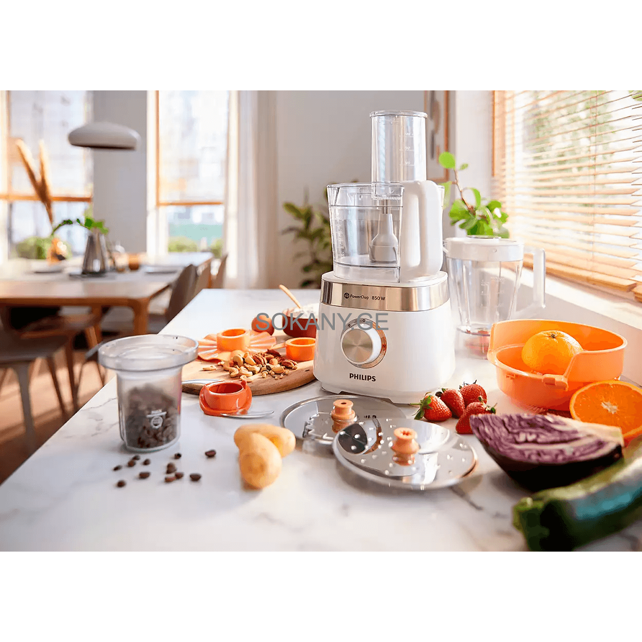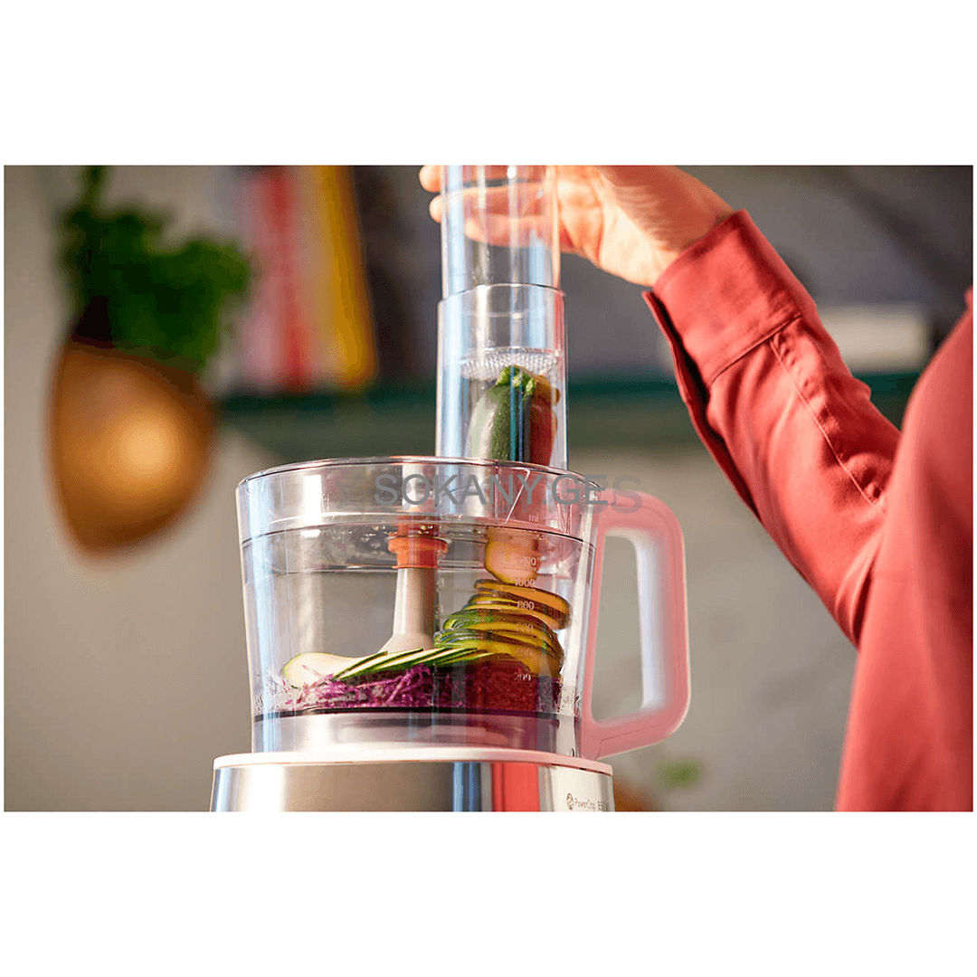 დამატებით მახსსიათებლები:წვრილად/მსხვილად დასაკეპი ჩანართი / PowerChop ტექნოლოგია / თხელ/სქენ ნაჭრებად დასაჭრელი ჩანართი / ცომის მომზადების საცმი / წვენსაწური: ციტრუსებისთვის / ნაწილების გარეცხვა შესაძლებელია ჭურჭლის სარეცხ მანქანაში