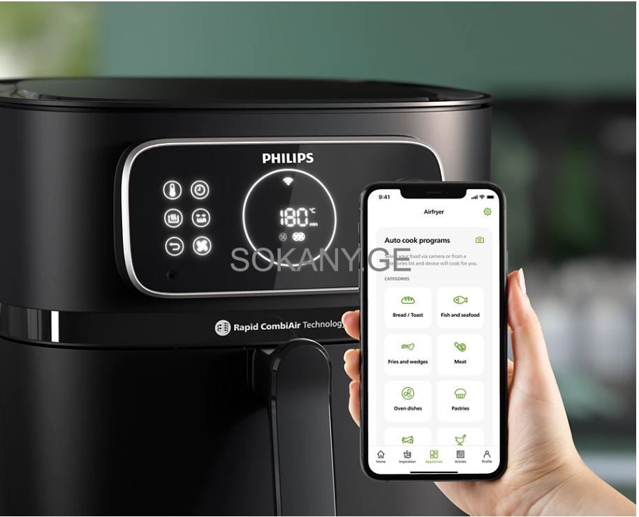 დამატებითი მახასიათებლები:ავტომატური გამორთვა / ცივი კედლის ექსტერიერი / მარტივი გასუფთავება / LED დისპლეი / Wi-Fi დაკავშირებულია / Rapid Air ტექნოლოგია / ცხიმის მოცილება / HomeID აპლიკაცია / Keep Warm ფუნქციით / ფრი / შეწვა / გრილი / ცხობა / One-pot cooking / Stir-fry / Stir-frying / გათბობა / გალღობა / ჩაშუშვა / კომბინირებული საცხობი / კომბინირებული შეწვა / კომბინირებული გრილი