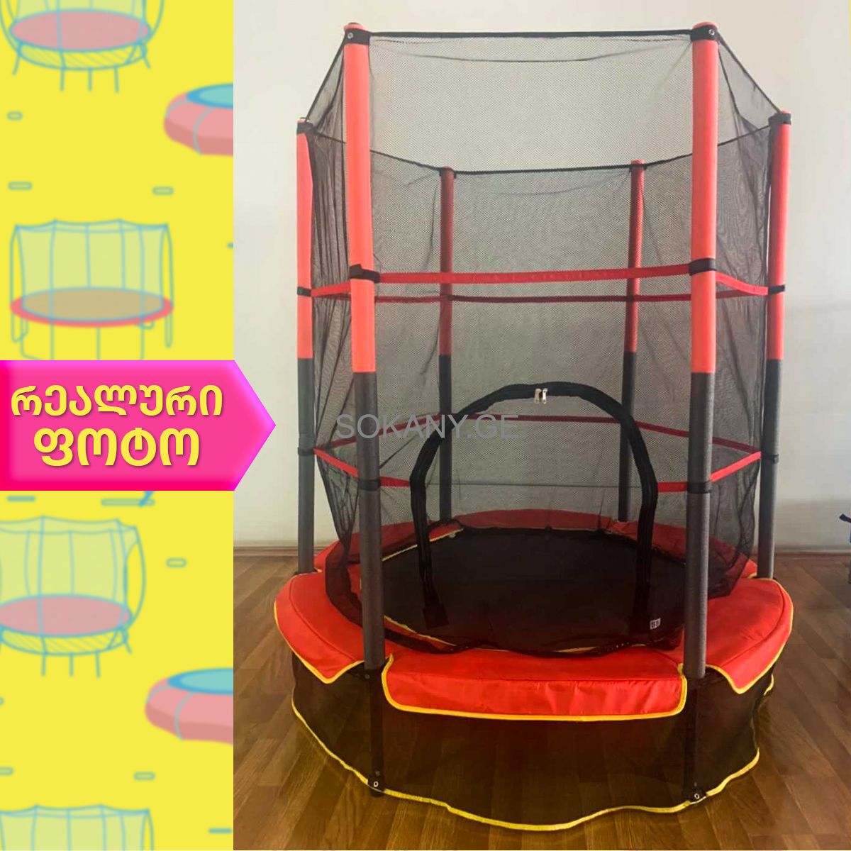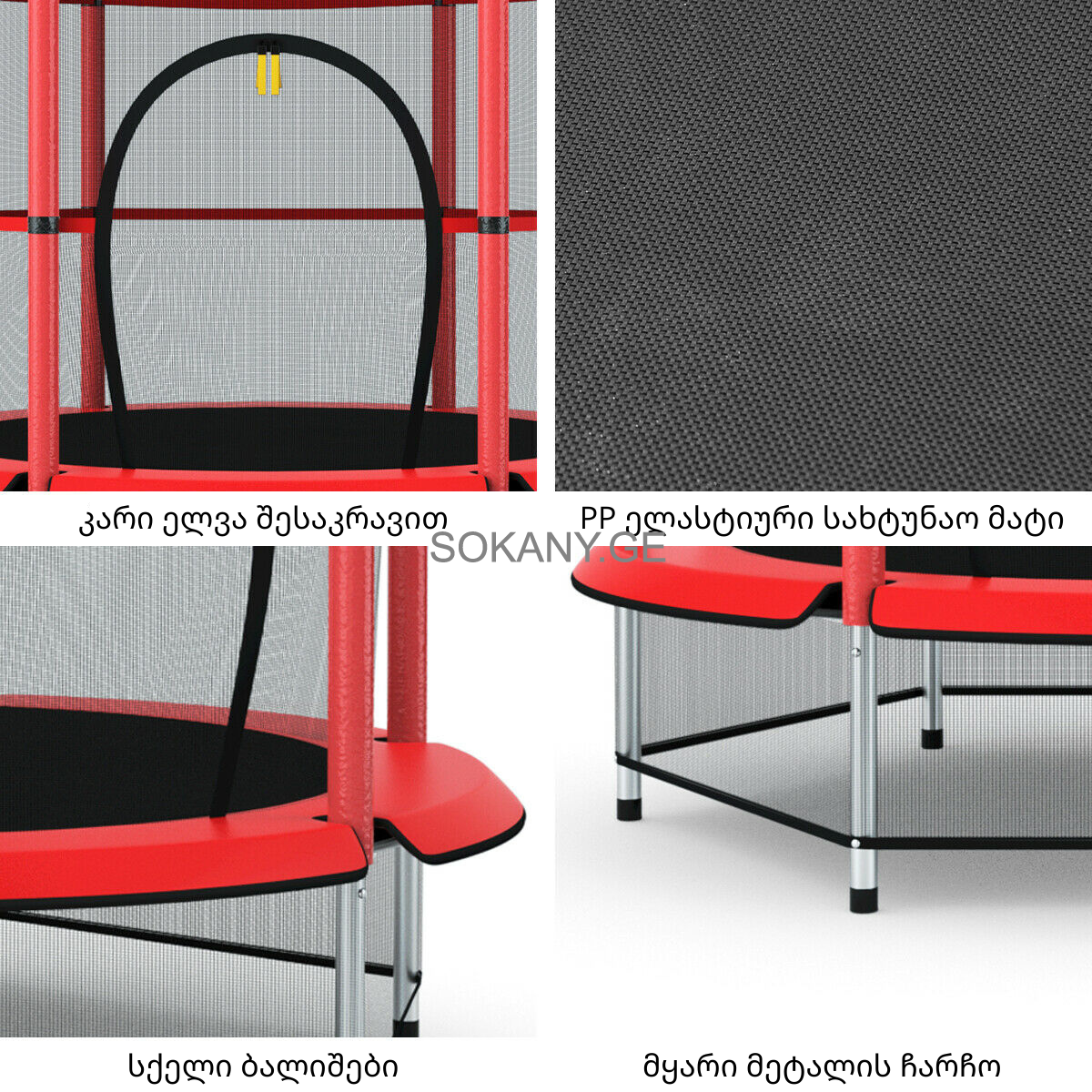 დამატებითი ინფორმაცია:ბატუტი დამზადებულია მეტალის მყარი კონსტრუქციისაგან. რკინები დაფარულია ვინილის სქელი "დარბილებებით". უსაფრთხოების ბადე იკვრება როგორც ელვა შესაკრავით, ასევე 3 ღვედით