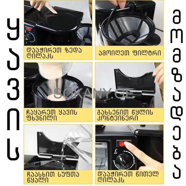 დამატებით მახსსიათებლები:ღუმელის მოცულობა: 9ლტ/ყავის აპარატის მოცულობა: 0.6 ლტ (4 ჭიქა)
