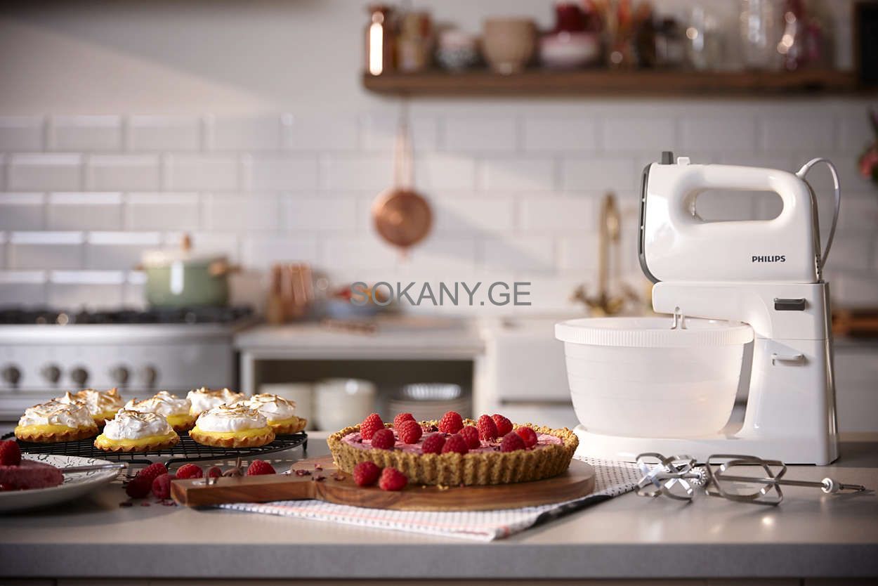 კომპლექტაცია:მიქსერი PHILIPS HR3745/00 / განსაკუთრებული კონუსის ფორმის სადღვები / ცომის საზელი / ჯამი მოცულობით 3ლ