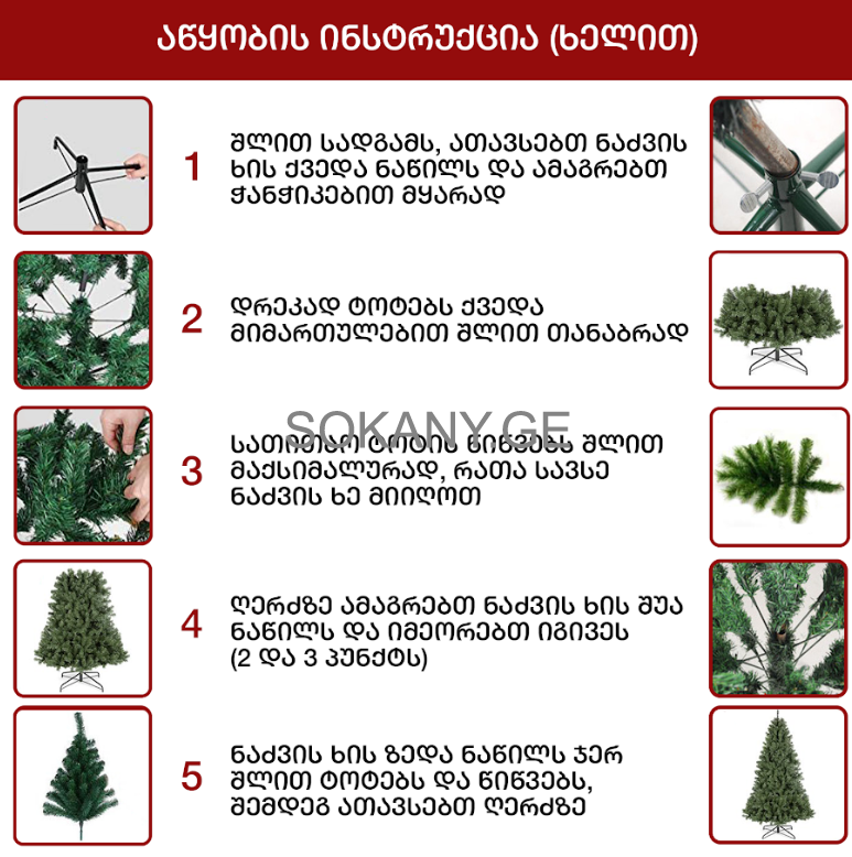 დამატებითი მახასიათებლები:ნაძვის ხე გამძლე დრეკადი მეტალის ტოტებით და ჯანმრთელობისთვის უსაფრთხო მასალისგან დამზადებული წიწვებით. მეტალის მყარი სადგამით და მთავარი ღერძით.