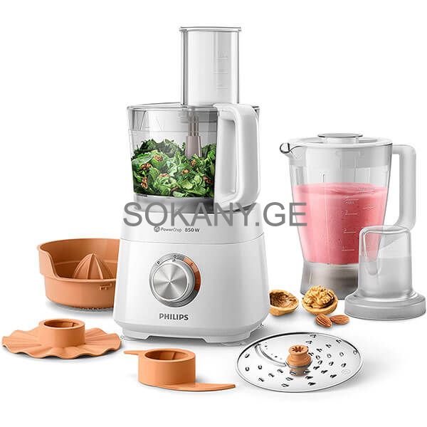 დამატებით მახსსიათებლები:წვრილად/მსხვილად დასაკეპი ჩანართი / PowerChop ტექნოლოგია / თხელ/სქენ ნაჭრებად დასაჭრელი ჩანართი / ცომის მომზადების საცმი / წვენსაწური: ციტრუსებისთვის / ნაწილების გარეცხვა შესაძლებელია ჭურჭლის სარეცხ მანქანაში