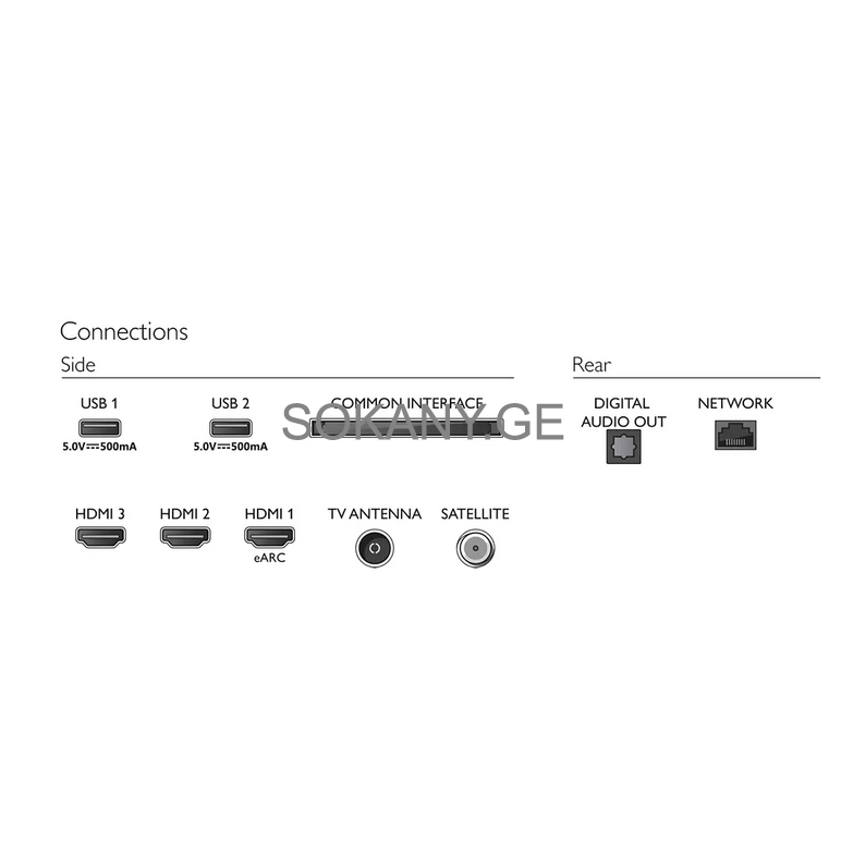 ინტერფეისი:3 x HDMI / 2 x USB / 1 x CI+ სლოტი / 1 x RJ-45 / 1 x Optical / 1 x RF (სატელიტი) / 1 x Audio 3.5 მმ- ჯეკი